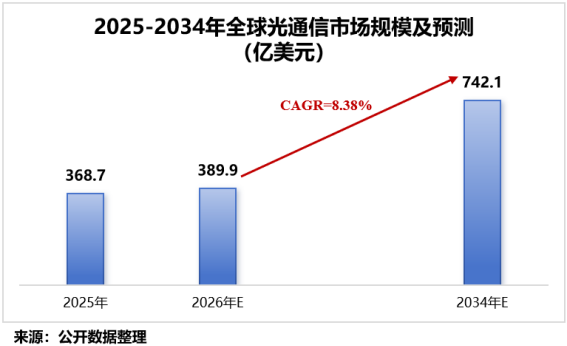 数据表露,2025年全球光通讯阛阓畛域为368.7亿好意思元;瞻望到2034年这一数字将增长至742.1亿好意思元,年复合增长率为8.38%。