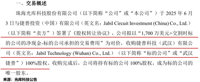 2025年6月,公司以1700万好意思元(约1.22亿元东谈主民币)的对价完成对捷普科技100%股权的收购,并将其改名为武汉光库。